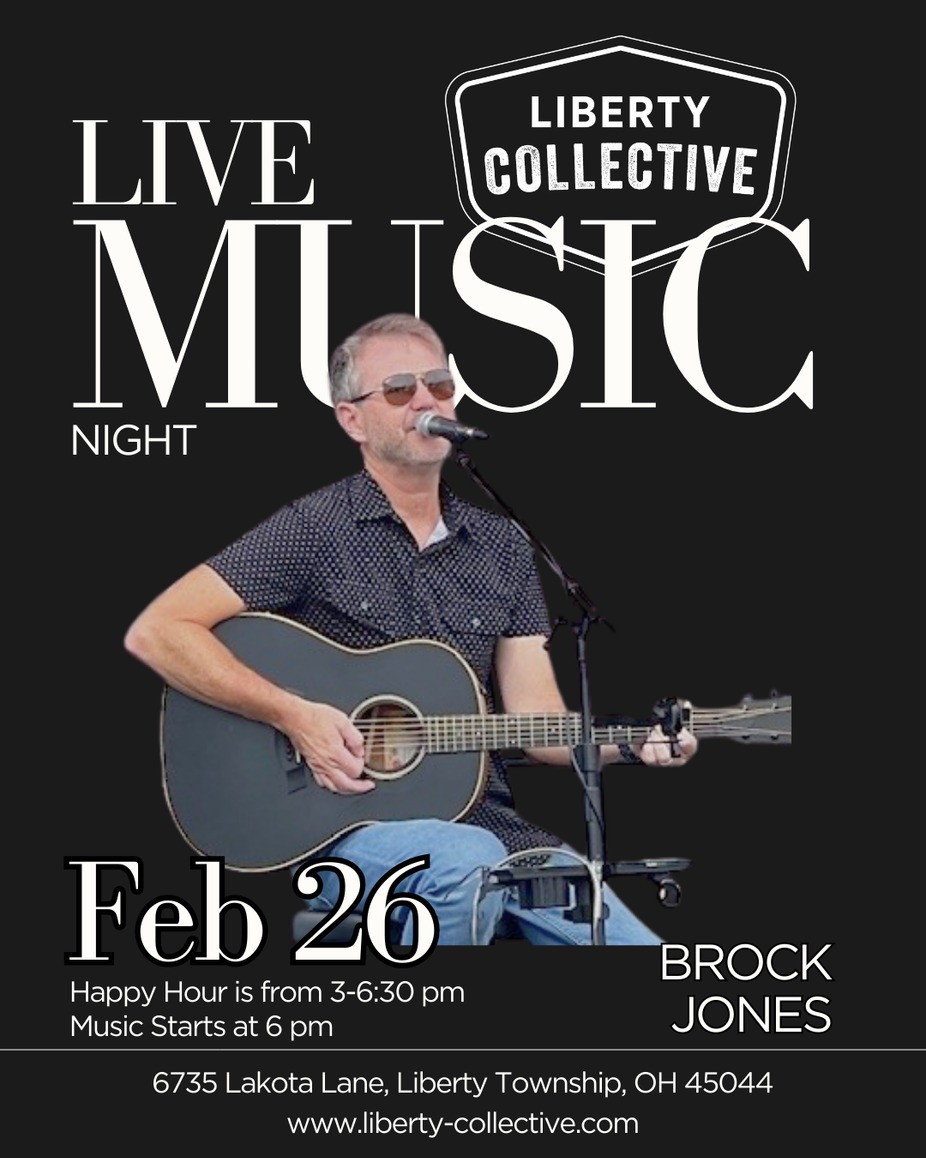 Live Music Night at Liberty Collective! Join us for a performance by Brock Jones, starting at 6 PM. Come early and enjoy Happy Hour from 3–6:30 PM before the music kicks off!
