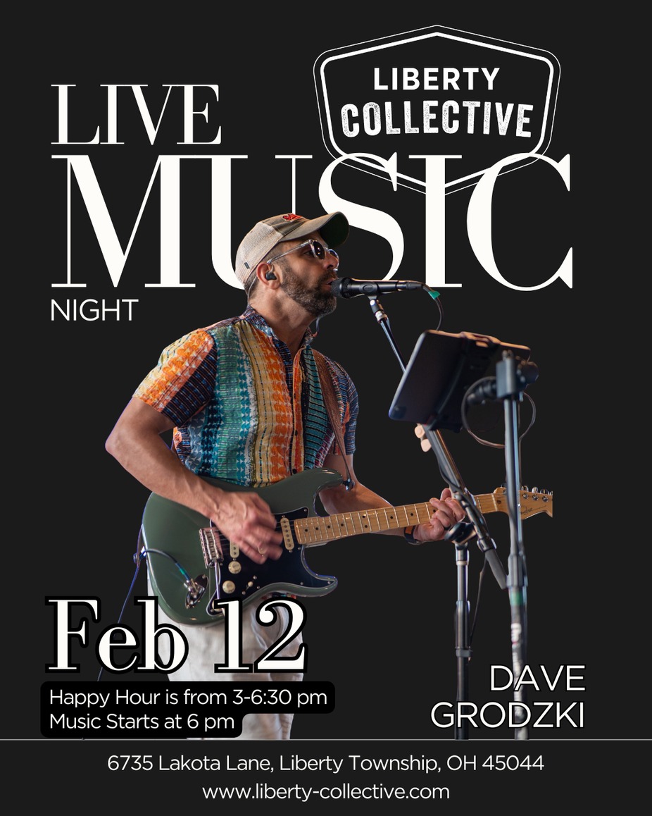 Live Music Night at Liberty Collective! Join us for a performance by Dave Grodzki, starting at 6 PM. Come early and enjoy Happy Hour from 3–6:30 PM before the music kicks off!